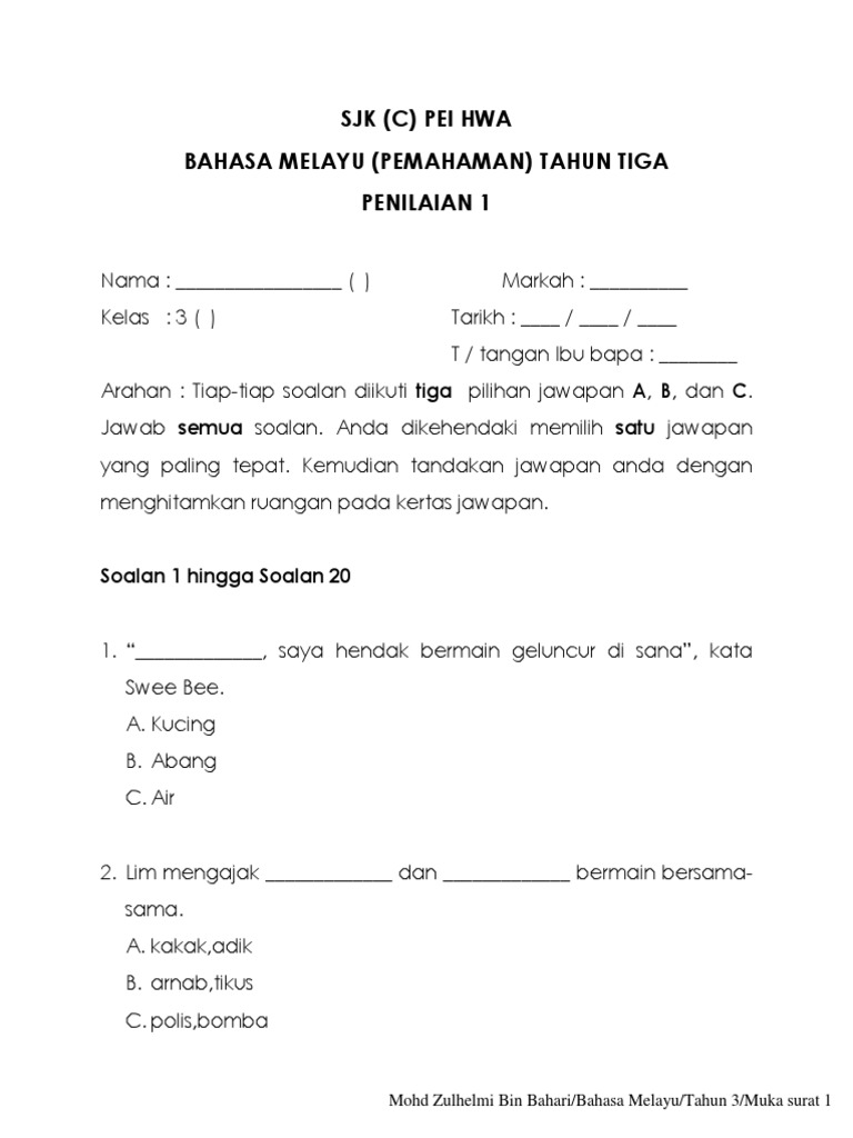 Sjk C Pei Hwa Jb Bahasa Melayu Pemahaman Tahun 3 Penilaian 3 Pdf Free Download