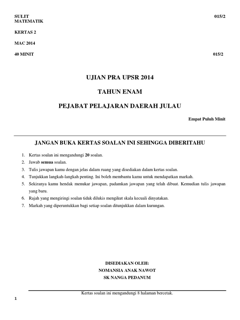 Ujian Pra Upsr 2014 Tahun Enam Pejabat Pelajaran Daerah Julau