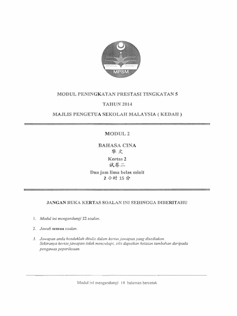 Trial Kedah 2014 Spm Bahasa Cina K2 Dan Skema Orang
