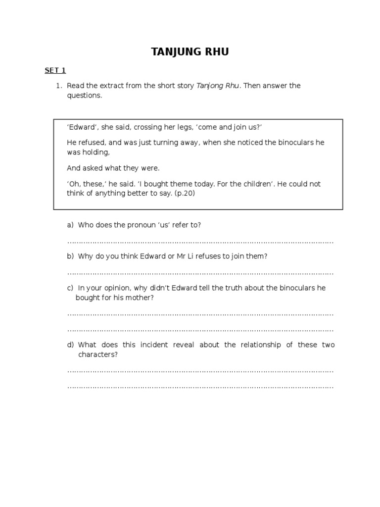 Form 4 Short Story Tanjong Rhu Sample Answer