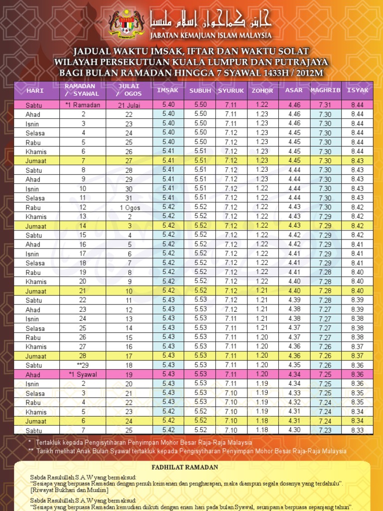 Taqwim Solat Ramadhan 1433h 2012 M Kawasan Kl Dan Putrajaya
