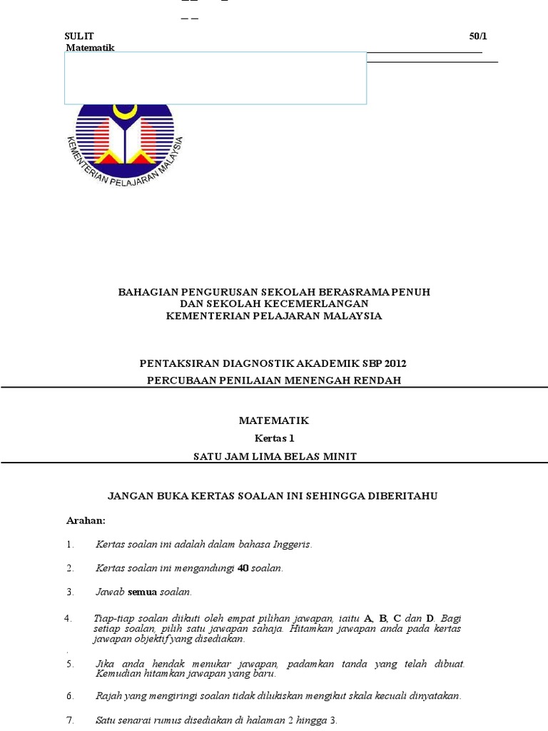 Sulit 50 1 Matematik Ogos 2012 1 Jam Area Quantity