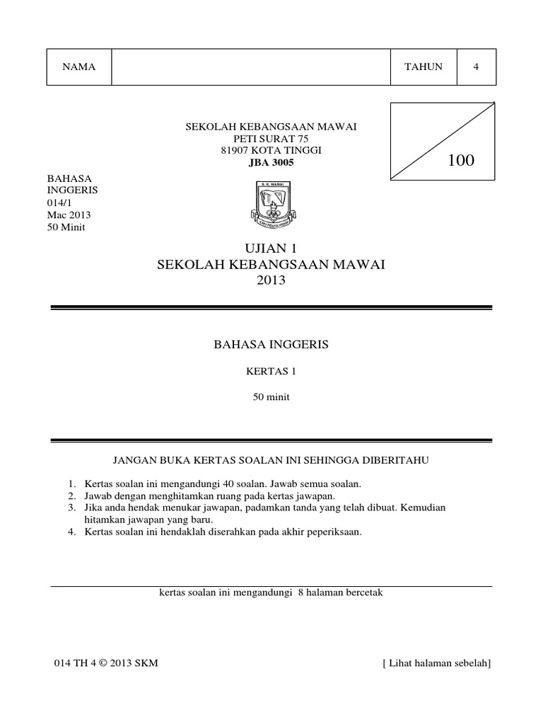 Ujian 1 Sekolah Kebangsaan Mawai 2013 Bahasa Inggeris