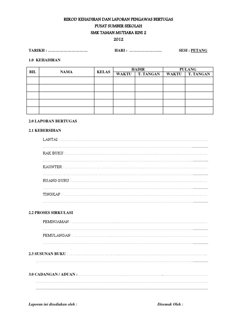 Rekod Kehadiran Dan Laporan Pengawas Bertugas