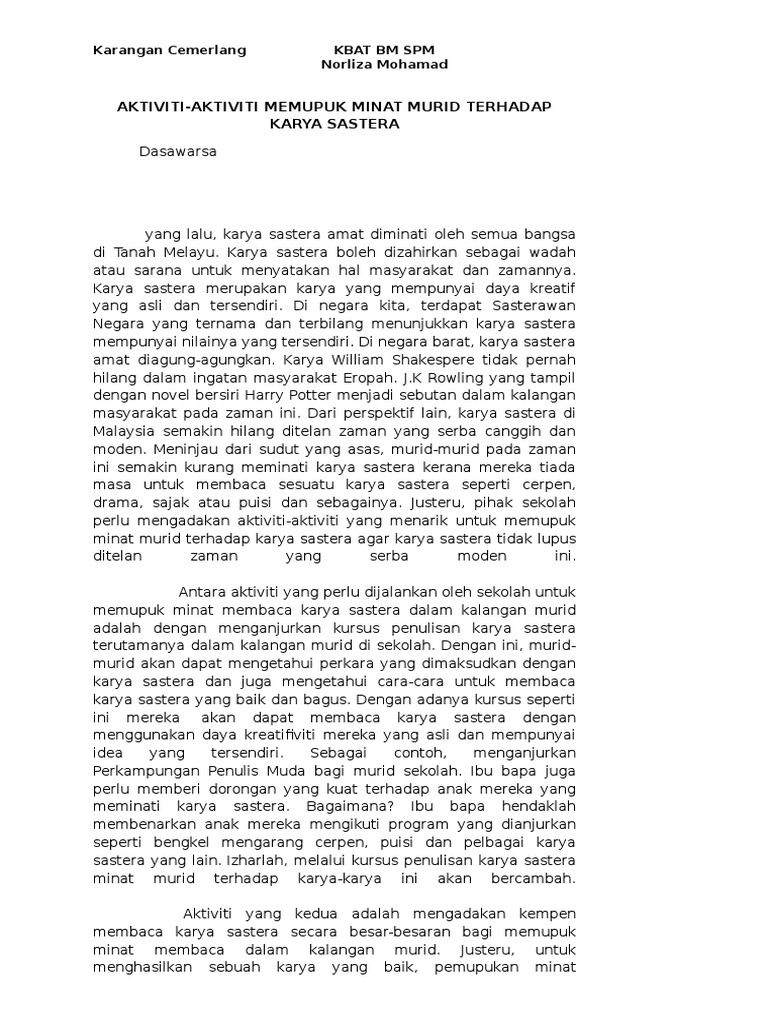 Karangan Cemerlang Aktiviti Karya Sastera