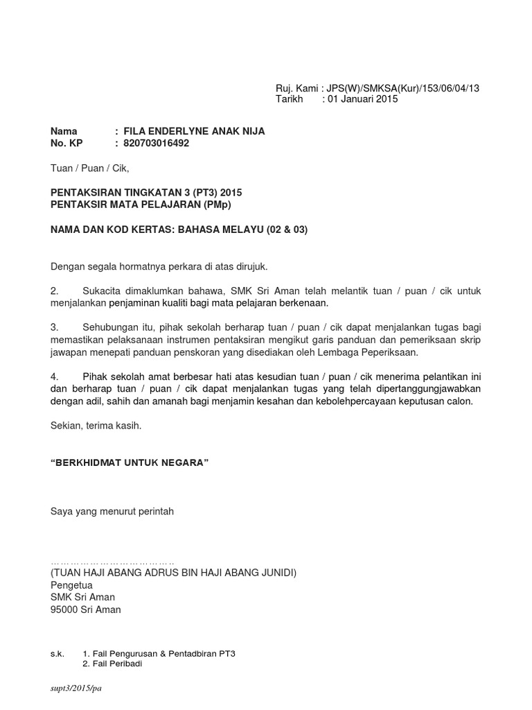 Surat Pelantikan Sebagai Ketua Pentaksir Pentaksir Pt3 2014